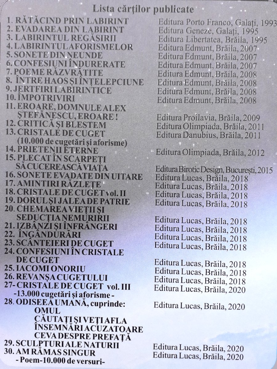 Am rămas singur... Cristale de cuget Odiseea umană Chemarea vieții și Seducția nemuririi Revanșa cugetului Izbânzi și înfrângeri Dorul și jalea de patrie Poeme răzvrătite Sonete evadate din uitare Prietenii eterne Plecat în scarpeți să cucerească viața Între haos și înțelepciune Confesiuni îndurerate Sonete și catrene Îngândurări Sculpturi ale naturii Amintiri răzlețe Alte cărți Lista completă a cărților publicate